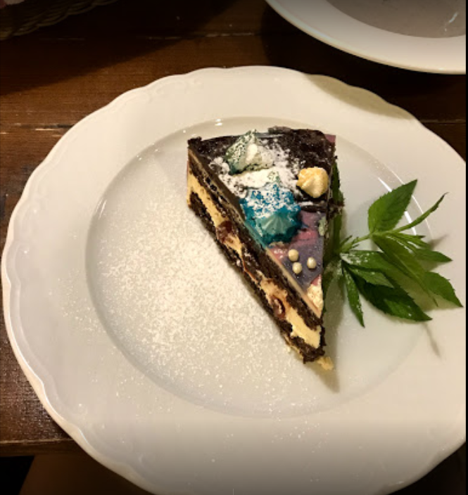 їх фірмові ковбаски з картоплею та квашениною.... квашенина... очікуєш капуста, а принесли лише 1 і це при тому, що порція невелика, тому ціна зависока шварцвальдський торт... так як я люблю солодке, тому не смачний....шоколадний бісквіт ще може бути, а от начинка ... не вершки, а на смак масляний крем