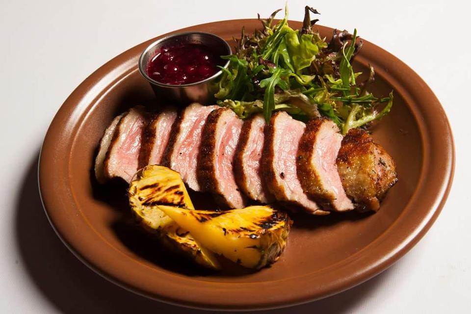 Качине філе з ананасом, салатним міксом та кисло-солодким журавлиним соусом приготовані на грилі. Дуже вишукано та смачно!